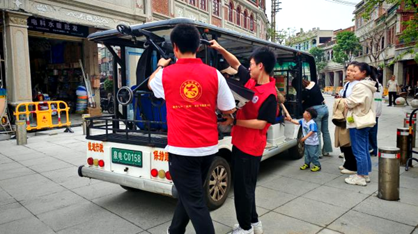在市区天后宫德济门广场和笋江公园公交接驳站,泉州七中“晦鸣”青年志愿服务队成为秩序维护的主力军。学生们或维持乘车秩序,或协助搬运行李,用暖心服务为游客提供引导。“这些学生志愿者非常棒,这里客流量大,看到他们忙前忙后维持秩序很辛苦,我们这些大人也都自觉起来,不给他们添麻烦。”正在排队等候“小白”的南京谢先生竖起大拇指说。泉州七中团委书记郭颖老师介绍:“2-4号正值旅游高峰,学生志愿者协调服务,让各个点位秩序井然,这样的方式既培养社会责任感,又以暖心服务带动游客共创文明旅游环境。”