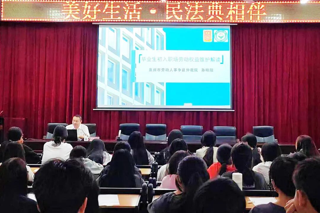 本次讲座由泉州市劳动人事争议仲裁院院长孙明阳主讲。他围绕民法典中与劳动者权益相关的条例规定,结合毕业生求职就业可能面临的劳动合同签订、试用期、薪酬等问题和实际案例,为“准劳动者们”讲授了一堂生动的普法教育课。