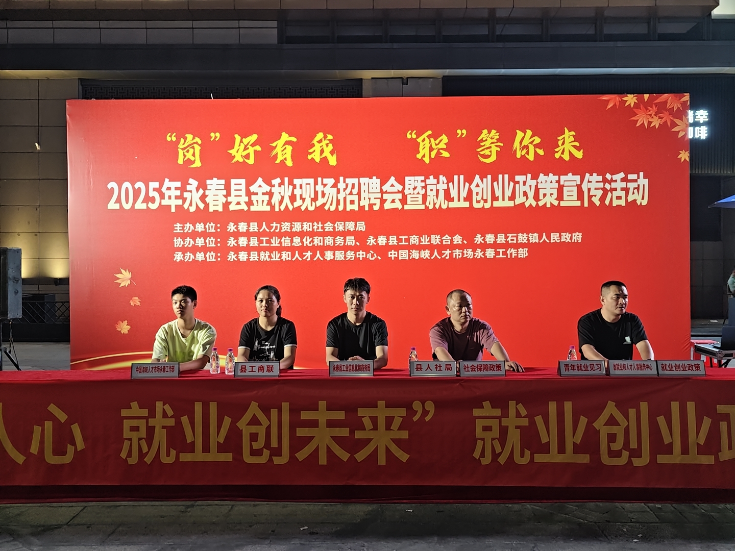 为推动高校毕业生等青年群体高质量充分就业,精准破解永春县外贸及重点产业企业“招工难、引才愁”痛点,10月10日晚,永春县人社局牵头举办“‘岗’好有我 ‘职’等你来”金秋现场招聘会,并同步开展就业创业政策宣传活动,以“招聘+服务”双轮驱动,为供需双方搭建高效对接桥梁。